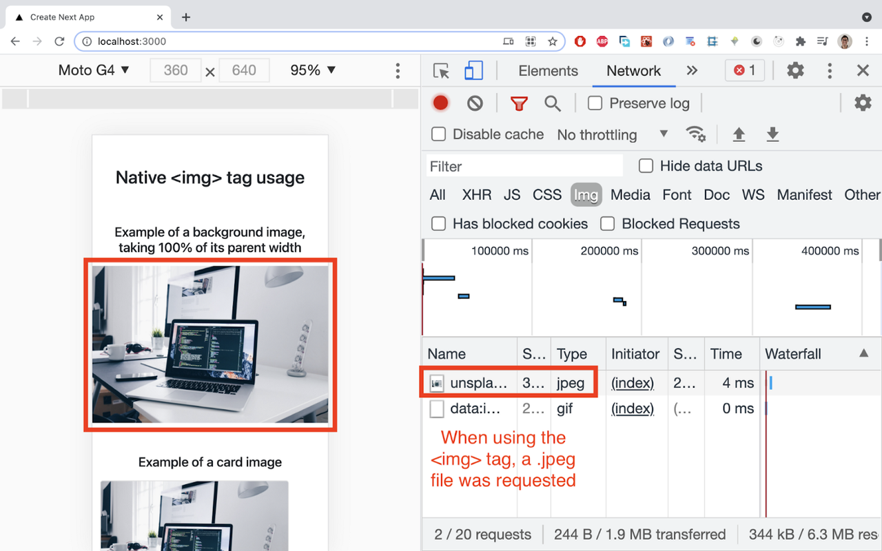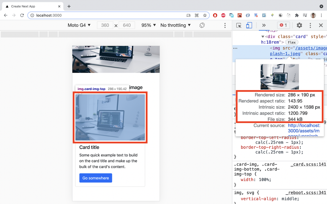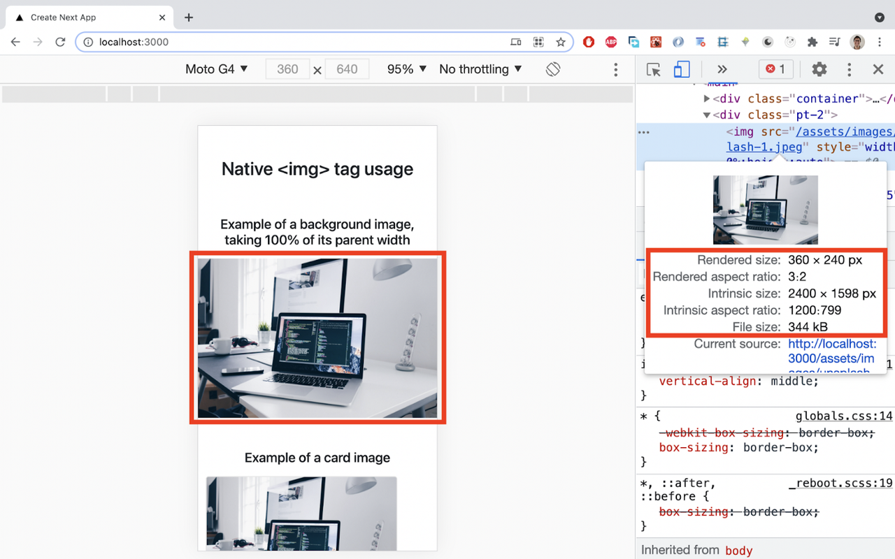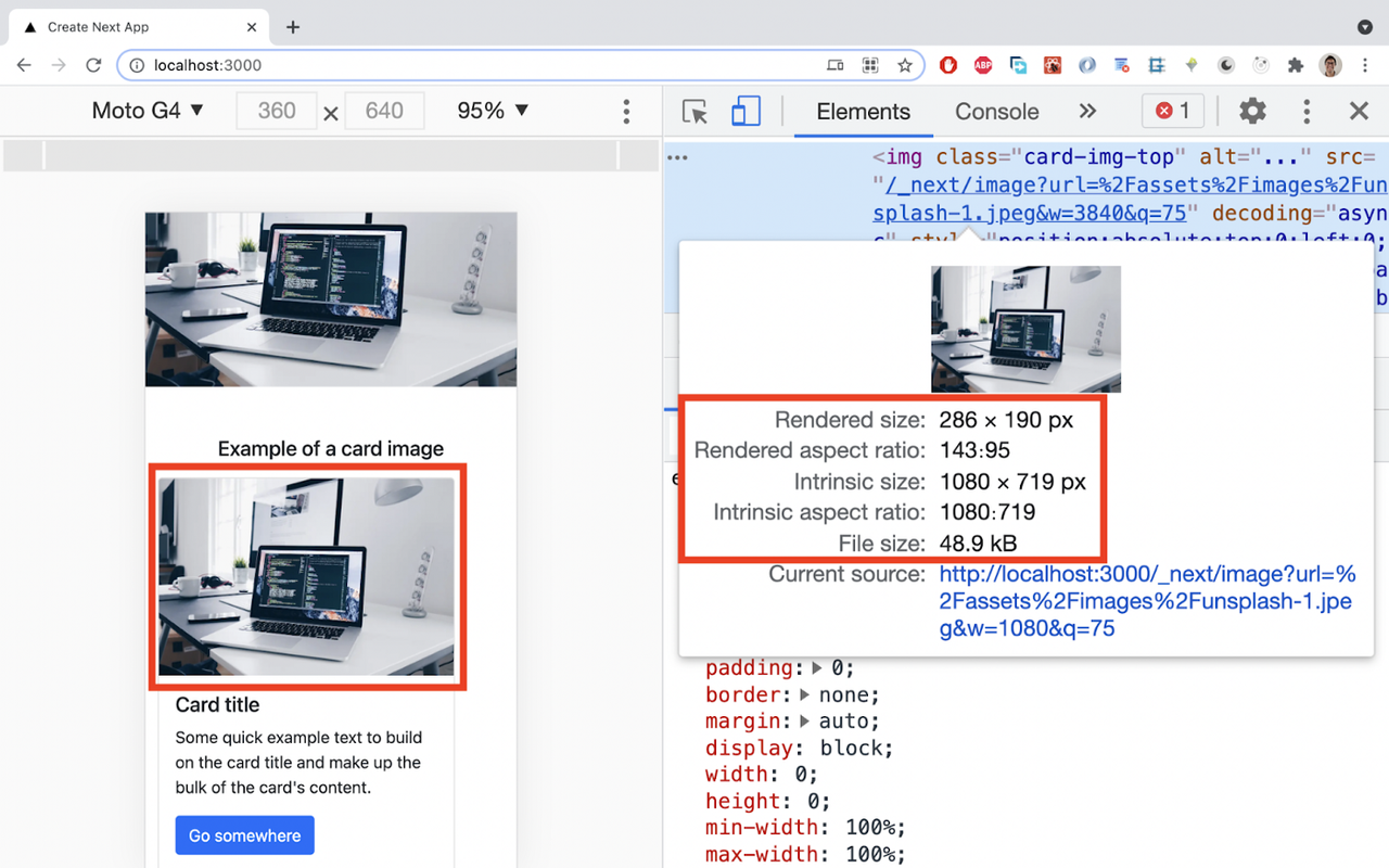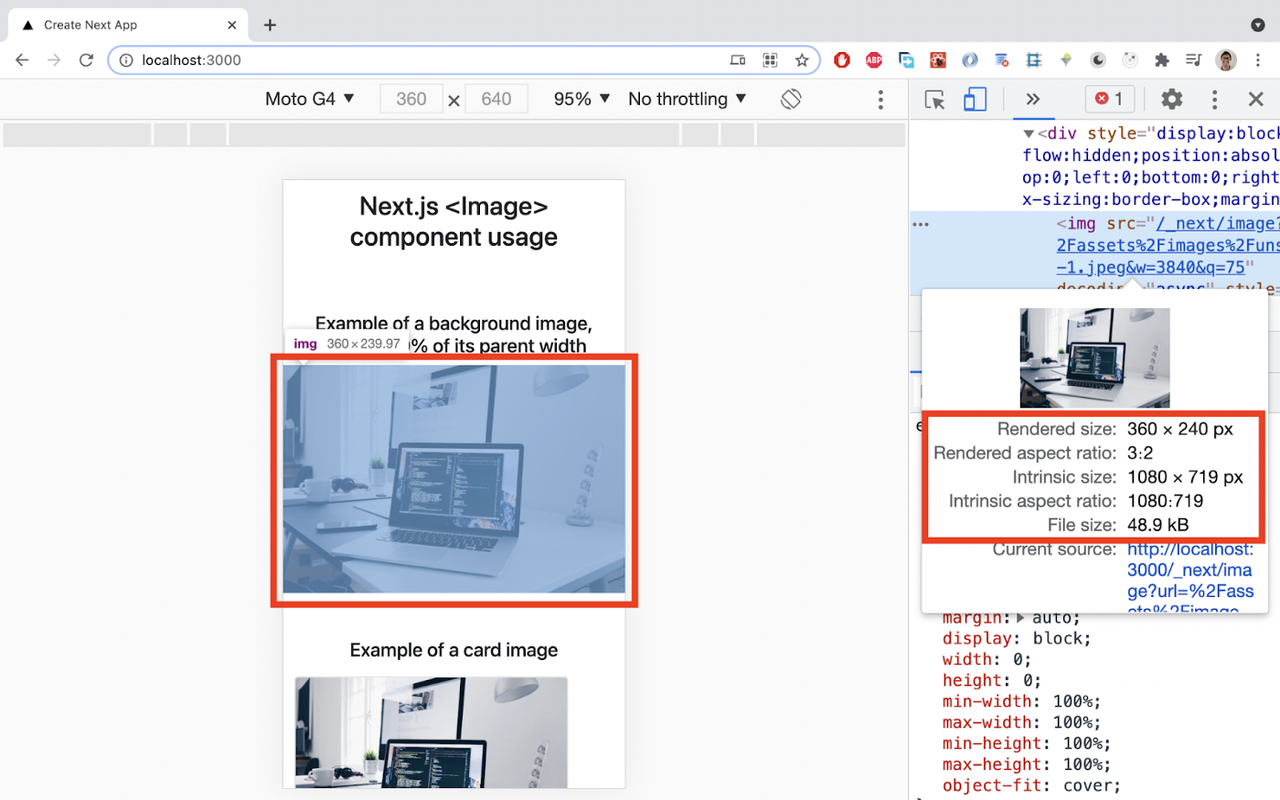 In this example, the original width and height were passed (2400 x 1598px) because the image will be scaled down for small viewports. That is what layout=”responsive” does for us. If there are super big viewports, Next.js also scales the image up as well.