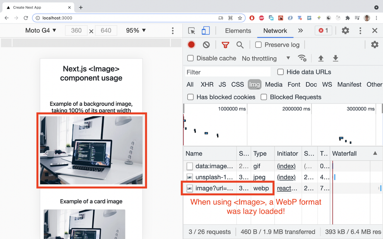 Let’s look at the Network tab on Chrome Dev tools to check the requested image format: