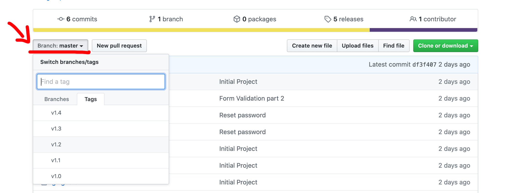 In some of my videos I will be asking students to checkout to specific version of the project. Project contains multiple "tags" (versions) of the code. To get speicific version of the project click on "Branch" on the left side and select tags.