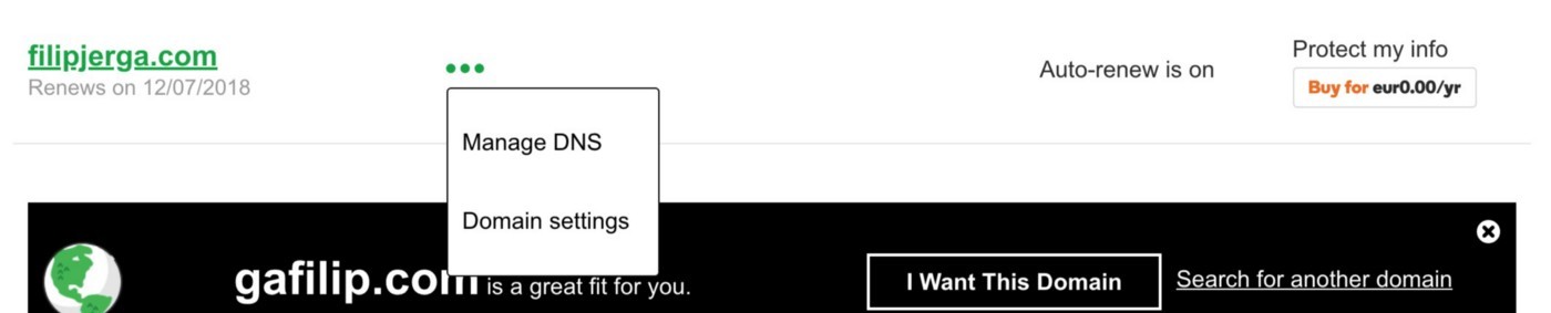 You can notice that you need to enter your website with “www” subdomain like “ www.your-site.com” in order to be presented with your Heroku app, When you do not enter subdomain “your-site.com” nothing happens. We need to setup CNAME for root address as we did with subdomain but this is not possible from manage panel on GoDaddy. So we need to do something else. Ideal solution would be change domain provider but I will go with forward solution. We can forward to subdomain when entering root address.