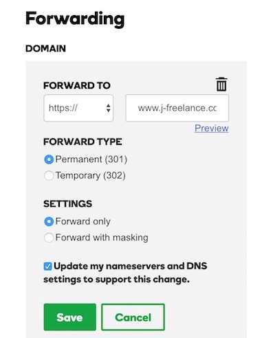 - Scroll down and go to forwarding, click settings and fill in data similar to mine but with your domain, do not forget for “www” subdomain. Now everything should be correctly set. Wait few minutes and test your new domain name.