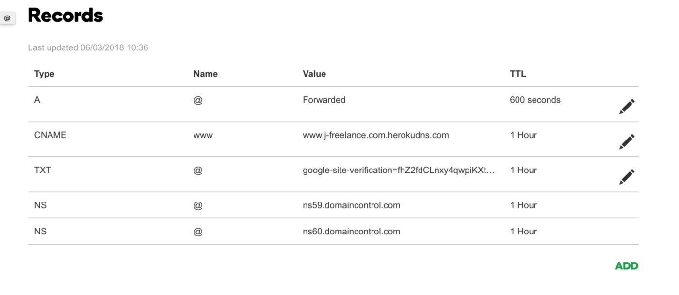 6 . You should see records table , you can delete all current CNAME entries. Then add CNAME similar to mine but as value enter your Heroku DNS, not mistake for Heroku url!